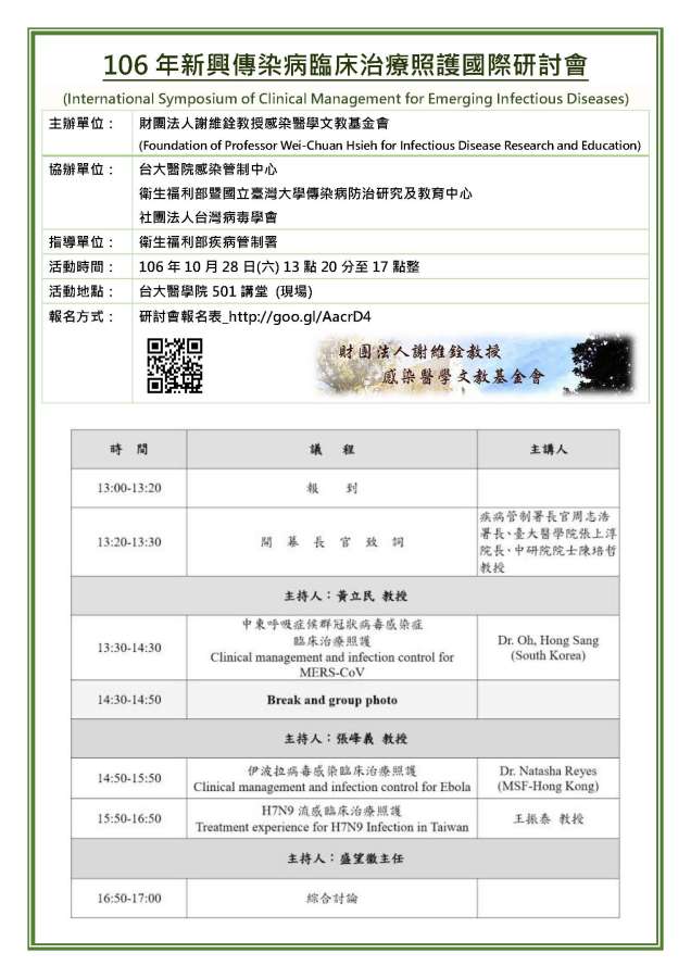 2017-10-23106年新興傳染病臨床治療照護國際研討會, 歡迎大家儘早報名參加
